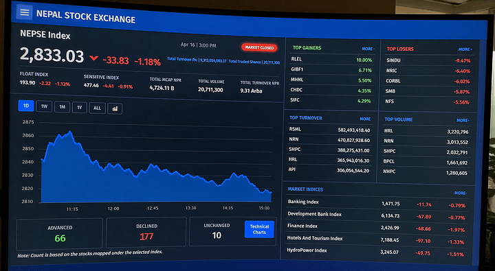 काठमाडौं । नेपालको शेयर बजार Nepal Stock Exchange (नेप्से) मा बिहीबार गिरावट देखिएको छ। आज कारोबारको अन्त्यमा नेप्से परिसूचक ३३.८३ अंकले घटेर २,८३३.०३ बिन्दुमा बन्द भएको छ, जुन अघिल्लो कारोबार दिनको तुलनामा करिब १.१८ प्रतिशत गिरावट हो। आज बजारमा कुल ३४२ कम्पनीका २ करोड ७ लाखभन्दा बढी कित्ता शेयर किनबेच भएका छन्। दिनभर भएका १ लाख ११ हजारभन्दा बढी कारोबारबाट करिब ९ अर्ब ३१ करोड रुपैयाँ बराबरको...